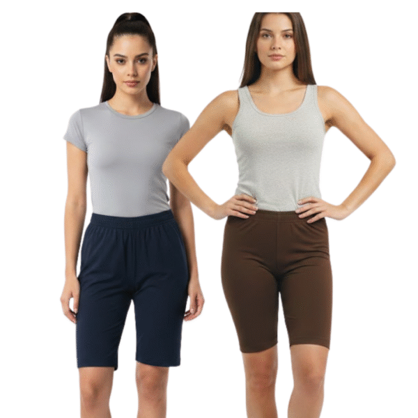 The stretchable waistband provides a secure yet gentle fit, preventing discomfort during movement. Lightweight and easy to maintain, these knee-length shorts are ideal for cycling, yoga, gym sessions, walking, travel, lounging, or layering under dresses. The pack of two offers added value and convenience for regular use.